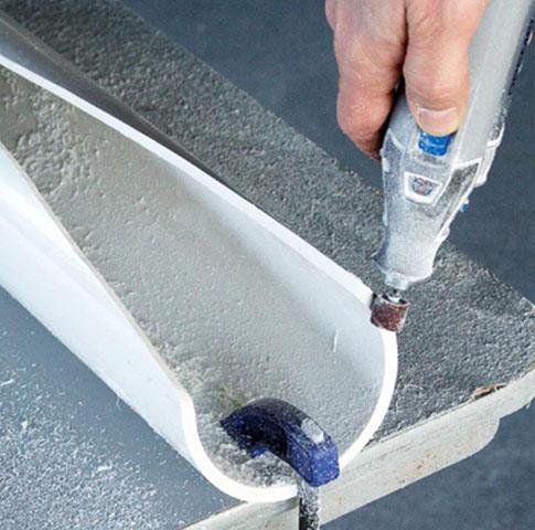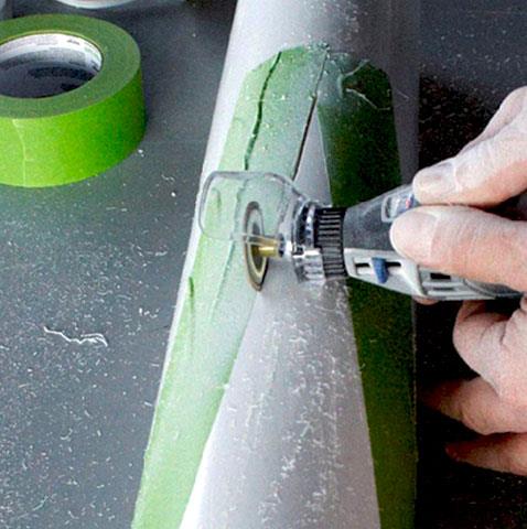 Fit a cutting disk into your Dremel multitool and set on medium speed to cut along the drawn lines along the edge of the painter's tape. Remove the cutting disk and insert a fine sanding ring to smooth along the cut edges, as shown below.